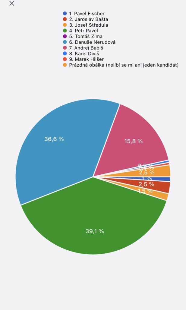 Celkem volilo 202 studentů z celkových 495. Volební účast tudíž byla 40,8 %. Z uvedeného grafu výsledků jde vidět, že ani jeden z kandidátů nebyl zvolen v první kole. Nejvyššího procentního úspěchu dosáhl Petr Pavel s 39,1 %, druhá skončila Danuše Nerudová se ziskem 36,6 %. Oba kandidáti se tedy utkají v druhém kole voleb. Třetí skončil Andrej Babiš s 15,8 % hlasů.