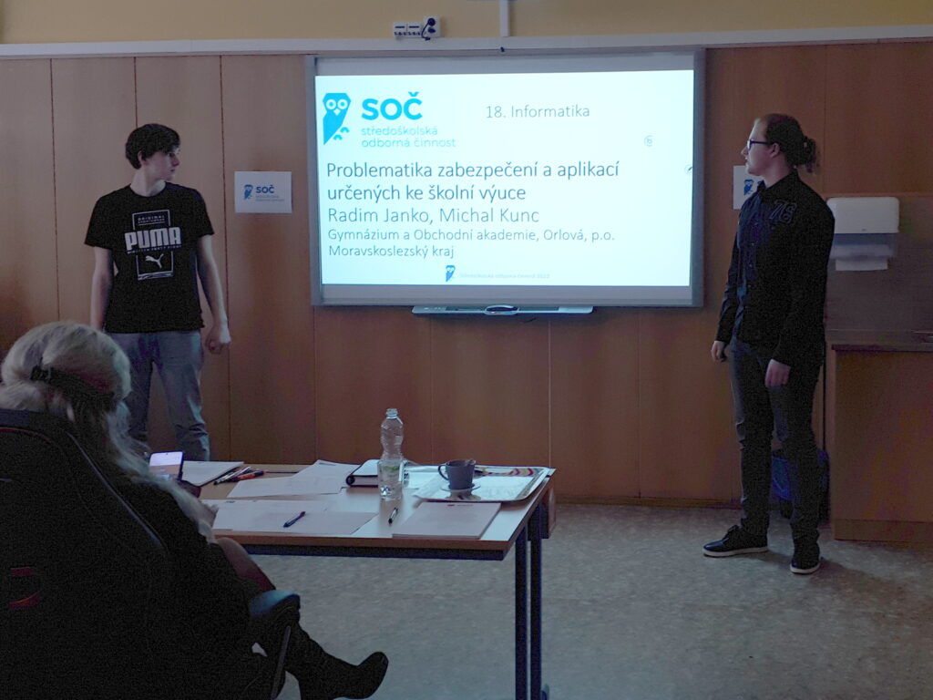 Po úspěšném školním kole dne 22. 3. 2023 postoupili do okresního kola žáci Michal Kunc (T2.C) a Radim Janko (T3.C) se společnou prací „Problematika zabezpečení a aplikací určených ke školní výuce“.