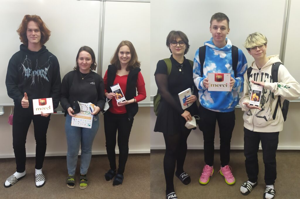 Ve čtvrtek 27. 1. 2022 proběhlo na naší škole školní kolo konverzační soutěže v angličtině pro kategorii IIB, tedy studenty tercie a kvarty. Soutěže se zúčastnilo 12 studentů a v obou jejích částech, poslechu a mluveném projevu, měli všichni velmi pěkné výsledky. První 3 místa obsadily studentky ze třídy G4.A: Vendula Gasiorková – 1. místo