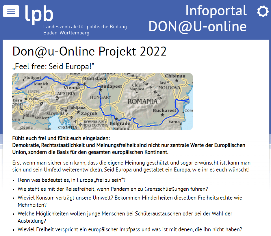 Opět je tu projekt Don@u-online, který umožňuje našim studentům komunikovat a diskutovat o různých tématech v německém jazyce. Letošní téma „Feel free: Seid Europa!“ je velmi aktuální, tj. zaměřené na demokracii a svobodu slova. Do projektu je zapojeno dohromady 28 škol z celého Podunají. Školy jsou rozděleny do skupin a spolupracují vždy konkrétní tři školní