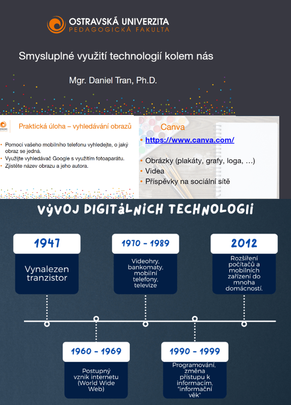 Dne 21. 6. 2023 k nám zavítal Mgr. Daniel Tran z Katedry informačních a komunikačních technologií Pedagogické fakulty OU, aby nás seznámil s novými technologiemi a jejich využitím ve výuce. Studenti T1.C a O1.A měli možnost se seznámit s různými užitečnými aplikacemi do výuky. Přednáška měla i část praktickou, při níž se studenti mohli doptávat