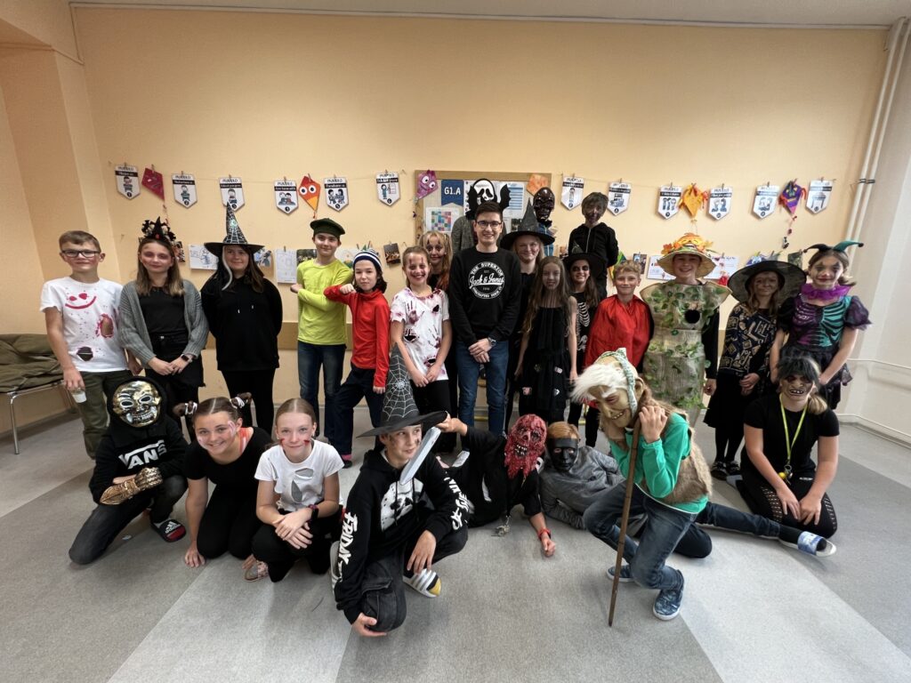 V úterý 1. listopadu 2022 se třída G1.A proměnila v bandu strašidel a duchů, čarodějnic a čarodějů, zombíků a upírů. Po náletu do ředitelny si za tradiční Halloweenskou říkanku vykoledovali pár sladkostí a pak se plynule přesunuli na košťatech do své třídy, kde ve skupinkách pomocí čar a kouzel luštili různé křížovky, navštívili strašidelný hrad